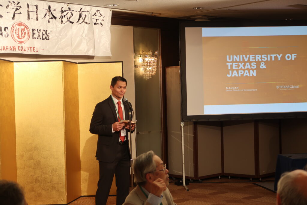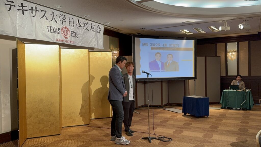 ものすごく簡単に説明するとUTの老舗日本人OB・OG会のことで、年次総会と親睦会を兼ねて日本で開催されます。直近UTの大学院をご卒業された世代から、一番上は1970年代にUTをご卒業された世代まで、幅広くご参加されます。在学中の学生が校友会に参加するケースが私が初めてであったとのことで、直近のAustinの環境を含めた近況報告、また、同じくMBAで今年5月にご卒業されたKSさんとAustinやUTを題材とした漫才を披露しました。